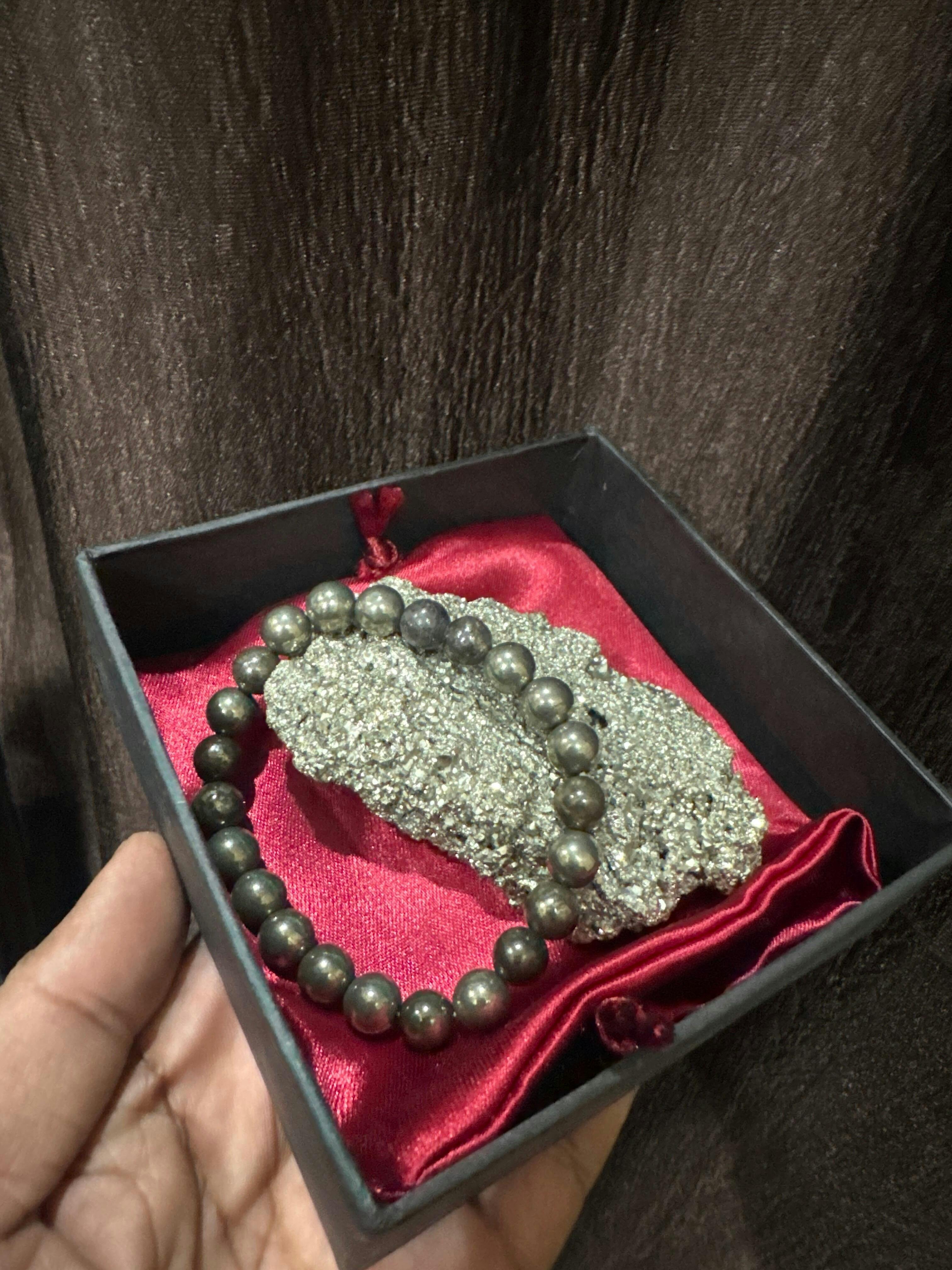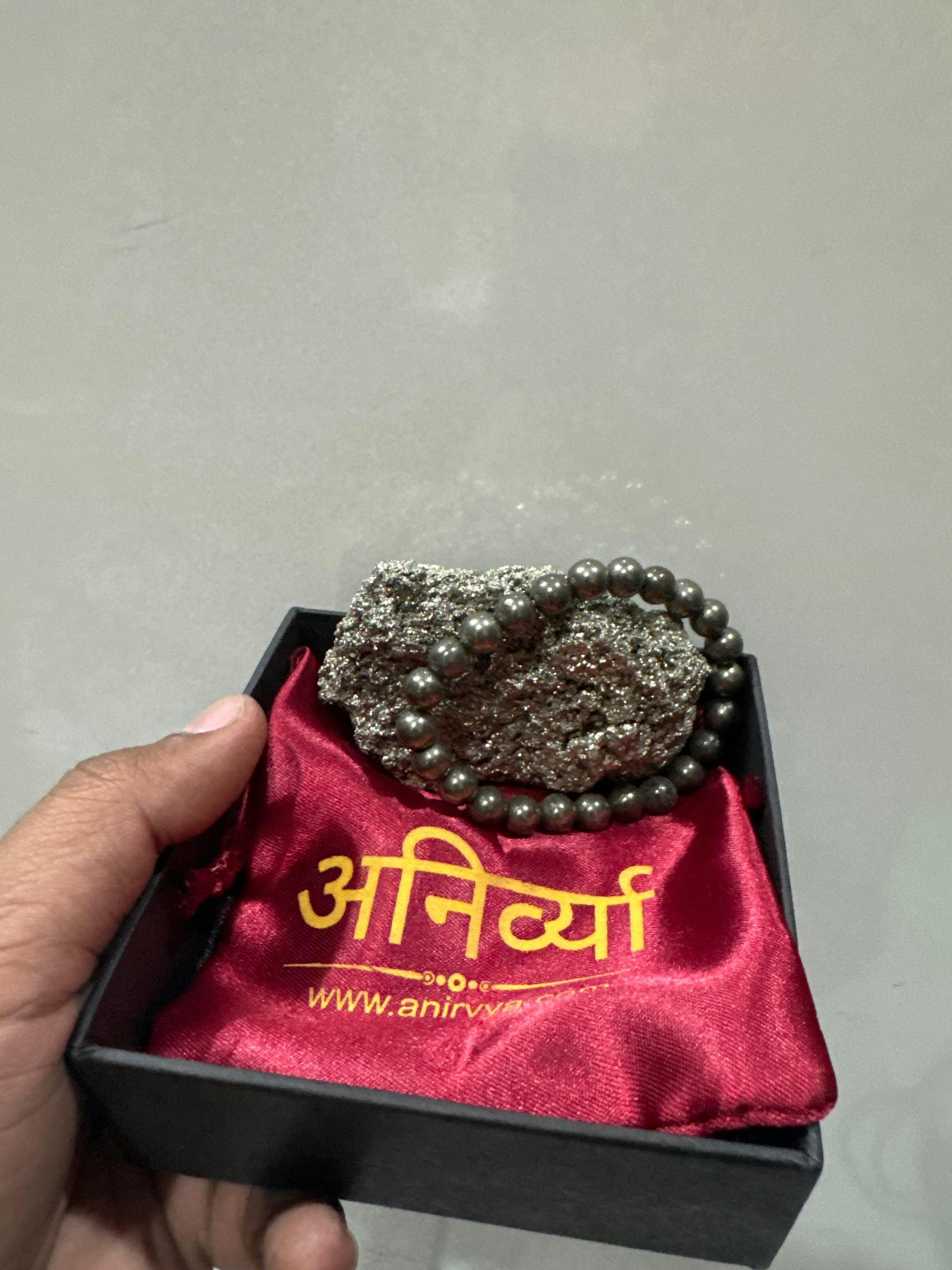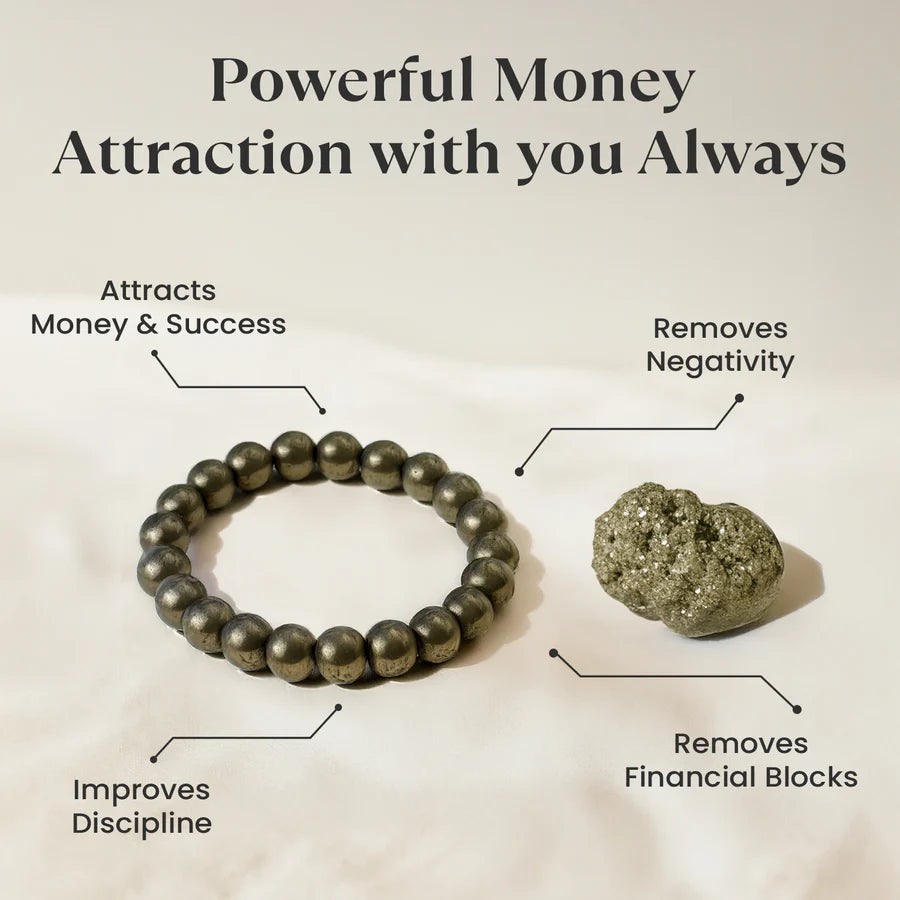 Bathe in abundance with the Dhan Varsha Combo, a powerful duo featuring a raw pyrite bracelet and a natural pyrite cluster. The raw pyrite bracelet energizes your aura with confidence and prosperity, while the pyrite crystal cluster amplifies financial intentions by uplifting the energy of your space. This Pyrite stone combo is ideal for manifesting growth, stability, and long-term abundance.