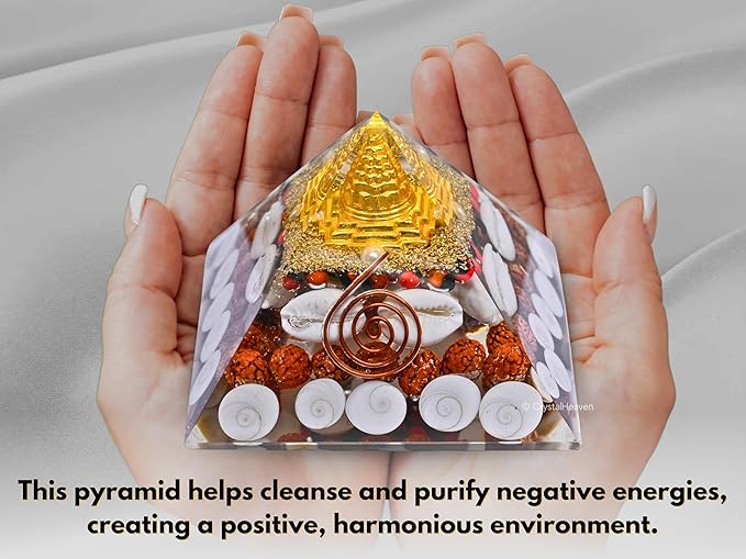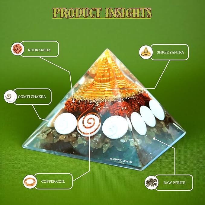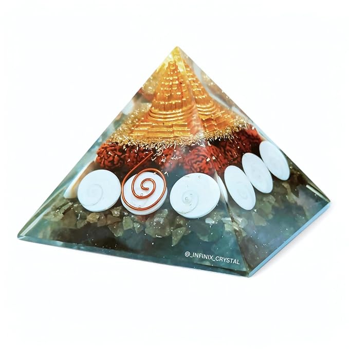• ✅ About the Pyramid :- This pyramid is handcrafted from natural certified Pyrite, Gomti Chakra & Rudraksha, measuring approximately 75–80mm and weighing around 250g.