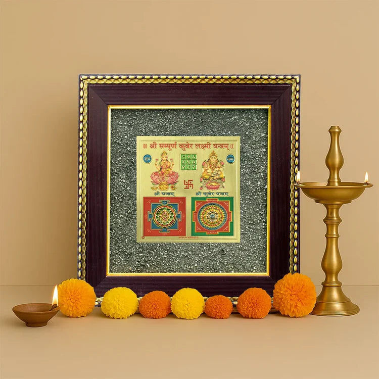 Bring abundance, protection, and divine grace into your life with this powerful combination. The Lakshmi Kuber Yantra on a Pyrite Frame unites the sacred energy of ancient geometry with the prosperity-enhancing vibrations of Pyrite. Goddess Lakshmi, the embodiment of wealth and fortune, together with Lord Kuber, the divine treasurer, blesses your home with financial stability, success, and continual growth.